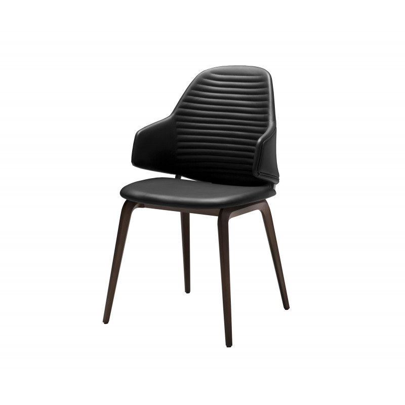 Vela Chair with shell in resin and wood with upholstery in leather or fabric and internal back with quilting. Wooden base in shiny lacquered finish, in Canaletto walnut or in other finish.