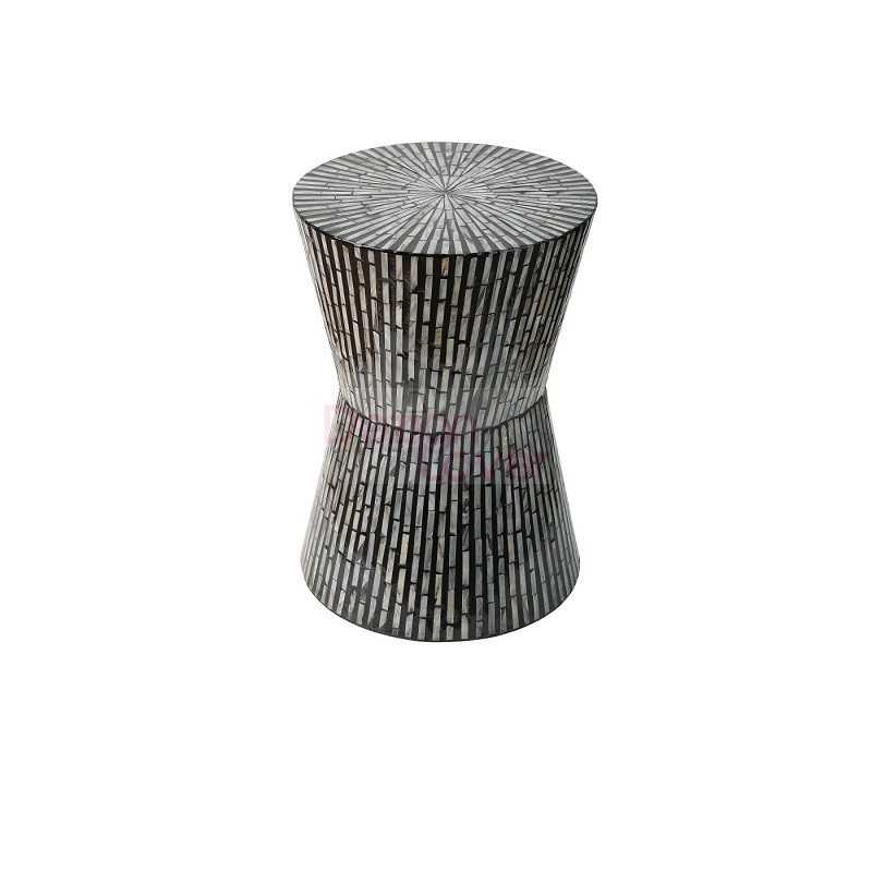 The Midnight Mosaic Shell Side Table features hand-laid natural shell tiles arranged in an intricate geometric pattern. Its sculptural hourglass silhouette brings refined texture and elegance to any interior, making it a striking accent piece for living rooms, reading corners, or bedside styling.