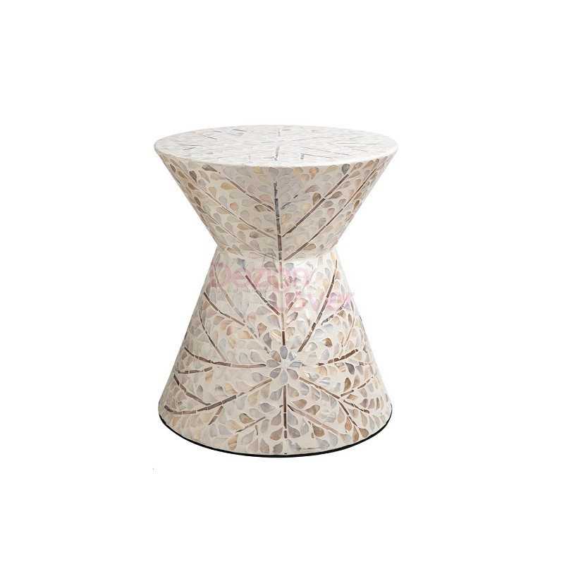 The pearl petal mosaic shell side table features hand-laid natural shell pieces arranged in a soft, petal-inspired pattern. Its sculptural hourglass silhouette and iridescent surface add a gentle glow, refined texture, and timeless elegance to any living room, bedroom, or reading nook.