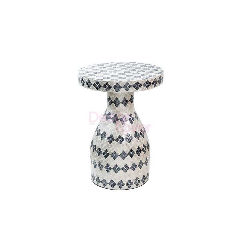 The Eclipse Mosaic Shell Side Table features hand-applied natural shell pieces arranged in a striking monochrome diamond pattern. Its smooth hourglass silhouette and shimmering pearlescent finish add a refined graphic touch, bringing modern elegance and visual depth to any living room, bedroom, or lounge space.