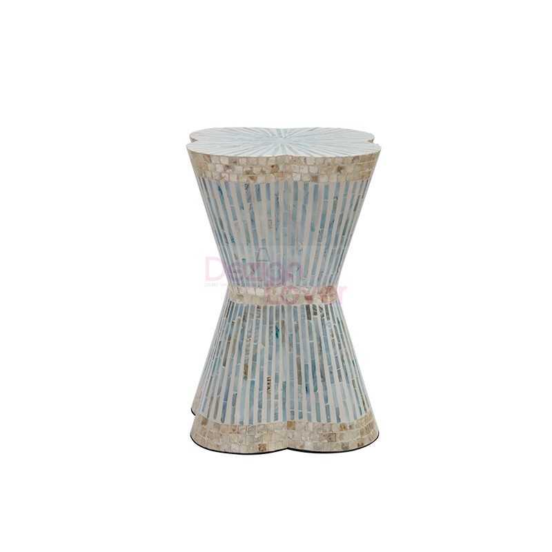 The Ocean Crest Mosaic Shell Side Table features hand-applied natural shell pieces arranged in refreshing blue and ivory tones, evoking the gentle rise of ocean waves. Its sculptural hourglass silhouette and luminous pearlescent finish add brightness, texture, and a serene coastal elegance to any living room, bedroom, or lounge space.