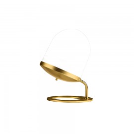 La lampe de table LED Horo a une structure en laiton, un diffuseur en verre prisme rond teinté. Le verre rond est monté sur un support en métal, Il émet une lumière douce et séduisante. Le plus petit cercle agit comme un projecteur fixé perpendiculairement au périmètre du plus grand cercle.La lampe de table LED Horo a une...