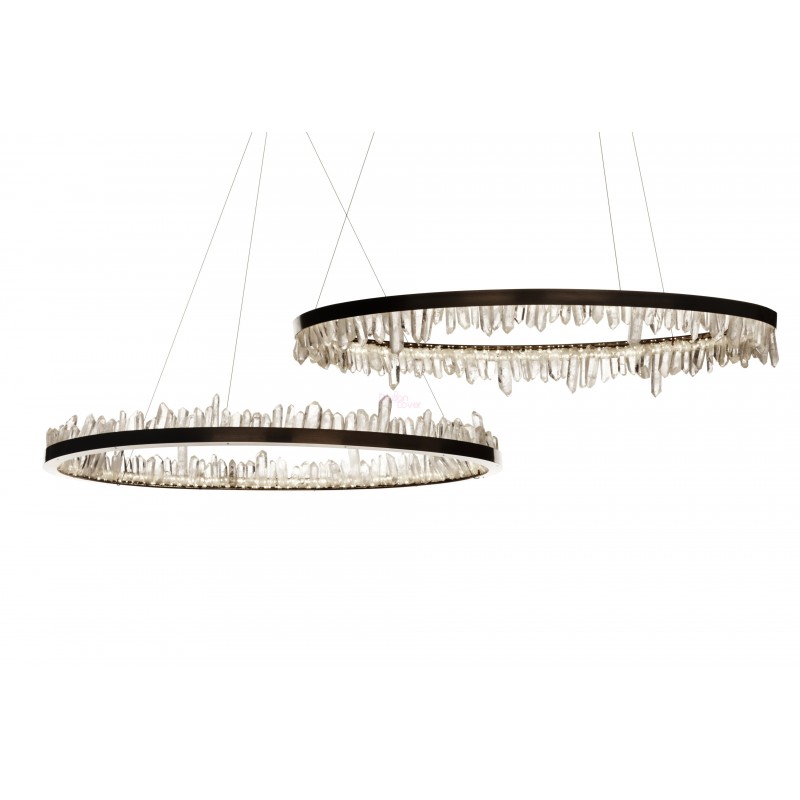 Les chandeliers Prometheus I et II sont des anneaux en métal suspendu avec des cristaux naturels clairs descendant ou dirigés vers le haut attaché avec des aimants. Les matériaux, la taille et le type d'éclairage sont personnalisables.Cette lampe élégante et moderne en vente rien que pour vous sur DezignLover.com ajoutera une note de luxe à n'importe quel espace