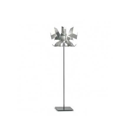 Le design du lampadaire Glow consiste dans des bandes métalliques repliées qui composent une forme éclatée mais symétrique. La lumière au centre du diffuseur est dirigée dans différentes directions.